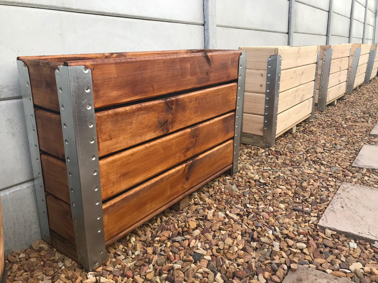 Made from South African pine wood radiata and built to order from new materials. They can be treated with a matt timber dark oak or clear varnish and lined with a natural fabric lining ready for planting at an additional cost per planter box. The black multi-purpose landscape fabric lining offers protection, permeable barrier against weeds, stabilises soil, retains moisture and improves filtration.